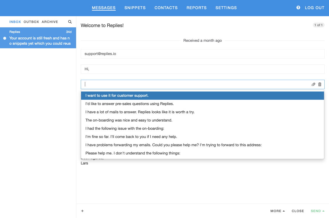 That way snippets with keywords will be automatically suggested if Replies finds them in the incoming message. Plus if you assign to-dos to messages, you’ll see responses (= snippets) you gave before for the same to-do. This comes handy if you get e.g. a lot of requests for the same bug.