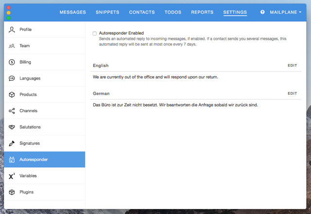 Use our new Autoresponder to let your customers know that you’re currently away from your desk. Simply go to Settings and then Autoresponder to enable the feature. You can create texts in all active languages.