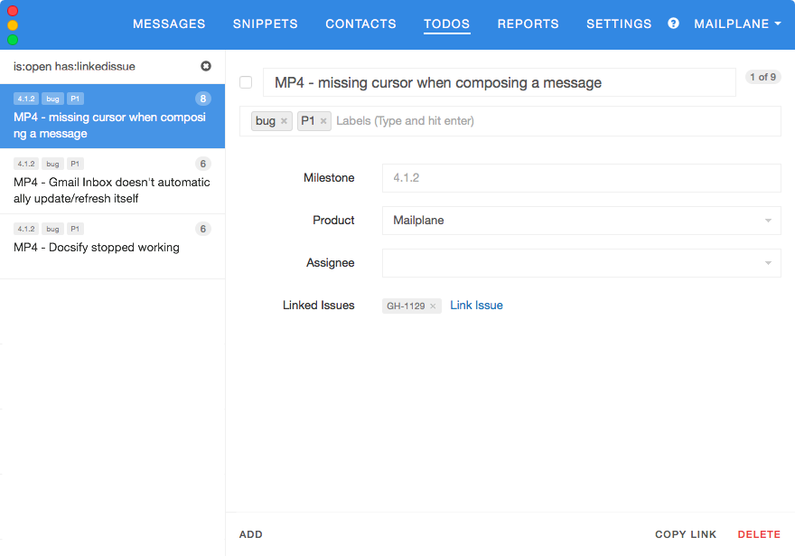 Go to ‘Settings > Integrations > Issue Trackers’ and add Github Repositories you’d like to connect to. You’ll then see ‘Link Issue’ in your todos (see screenshot below). Once linked, Replies will automatically update the milestone and complete/uncomplete the todo based on the linked Github issue.
