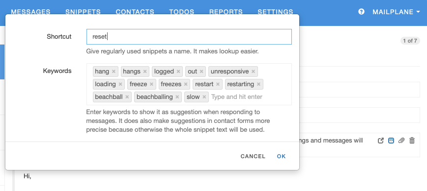 Adjust shortcuts and keywords of currently selected snippets directly from within the draft while writing responses.