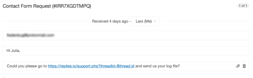 For example, you could send a link as response which contains the thread_id (e.g. https://example.com/support.php?thread_id=$thread.id) to get follow up information (e.g. log files) from the customer directly into the current conversation.